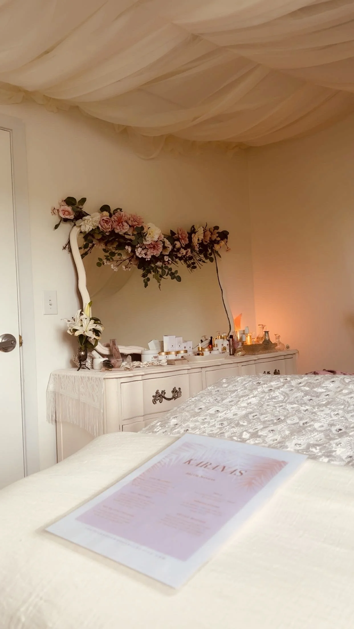 A decorated bedroom with a diamond-patterned bedspread, a floral mirror, flowers on the dresser, and a pink monthly calendar or planner on the bed.